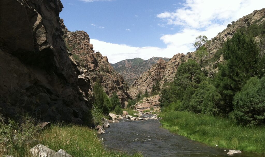 I pause to stretch my hunched shoulders and back, to look around, above the water, up into what this small stream of sparkling spring water has carved. The view around and above me starts with the tops of cedars stream-side, above them a 50-foot cliff of jagged schist twisted and folded in gun-metal gray and flecks of silver. Then 200 feet above that, a ridge of red Pikes Peak granite hogback dotted with pinon pine, and far above that, a thousand or more feet up, rounded and weathered hoodoos of black basalt, stark against the scattered white clouds framing the deep blue Colorado sky.
